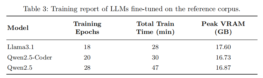 研究团队基于四条选择标准筛选了待微调的基础模型:代表最新技术水平(在 Hugging Face Open LLM Leaderboard 上排名靠前且下载量高)、开放权重(支持本地部署以保护数据隐私)、具备强大的代码能力(在多种编程语言上预训练的通用代码模型)以及参数量在 80 亿以内(适合单卡训练)。基于这些标准,最终选定了三款模型:Qwen2.5-7B(通义千问通用系列,具备强大的代码与数学能力)、Qwen2.5-Coder-7B-Instruct(通义千问代码专项系列,专精代码生成、推理与修复)以及 Llama3.1-8B(Meta 推出的多语言开源模型,在多项行业代码基准测试上表现出色)。
