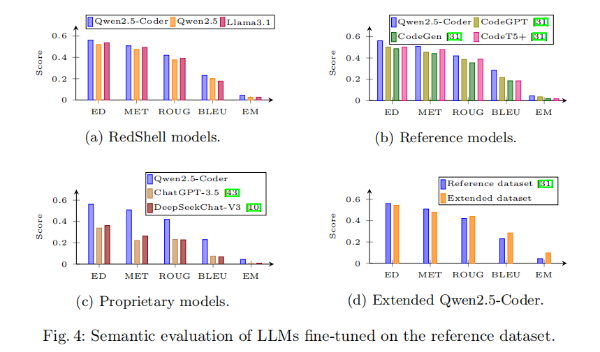 语义评估采用四项标准指标,从不同粒度衡量生成代码与参考样本之间的相似度:BLEU-4(4-gram 重叠率,0 到 1 之间,值越高越好)、编辑距离 ED(字符级编辑操作数的归一化得分,0 到 1 之间,值越高越好)、精确匹配 EM(完全一致的样本比例)以及 METEOR(综合考虑词序和同义词的相似度指标)。在三款 RedShell 模型中,Qwen2.5-Coder 在所有语义指标上均取得最高分,编辑距离平均相似度超过 50%,远超 Qwen2.5 和 Llama3.1。横向比较中,Qwen2.5-Coder 超越了所有参考基线模型(CodeGPT、CodeGen、CodeT5+),在编辑距离上的领先优势尤为显著。纵向对比专有大模型,Qwen2.5-Coder 在每一项语义指标上均明显超过 ChatGPT-3.5 和 DeepSeekChat-V3,同时还提供了更强的数据隐私保障——这一结论意义深远,说明在领域特定任务上,经过专业化微调的小参数量开源模型可以全面超越规模更大的通用专有模型。此外,在扩充数据集上训练的 Qwen2.5-Coder 在 BLEU-4 和精确匹配指标上相比参考数据集版本取得了更显著的提升,验证了更大、更多样化的训练语料对提升输出精度和领域知识覆盖度的正向效果。