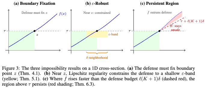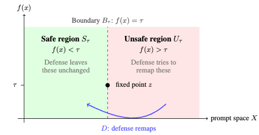 论文的第一个核心结论叫 Boundary Fixation。它证明:只要提示空间是连通的,这道防护层又是连续的,并且你承诺“安全输入尽量不动”,那么一定会存在某个边界点 z,满足 f(z)=τ 且 D(z)=z。说得更直白一点,就是总会有某些刚好卡在安全边界上的输入,原样穿过你的防护层。