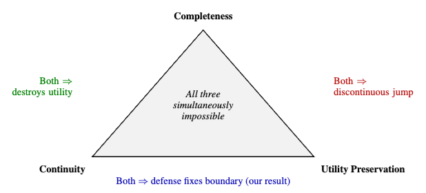 作者给出的答案是否定的。论文从理论上证明,对于这类 wrapper defense 来说,连续性、实用性和完备性三者无法同时成立,这正是标题里所谓的“不可能三角”。
