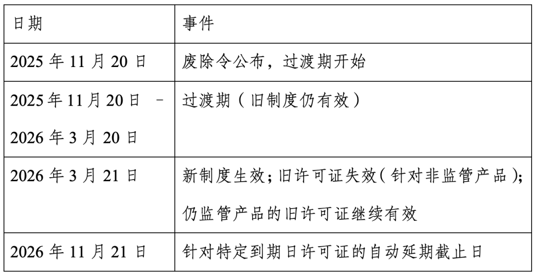 1.对不再受监管的产品:旧许可证将于2026年3月21日自动取消,无需再持有。