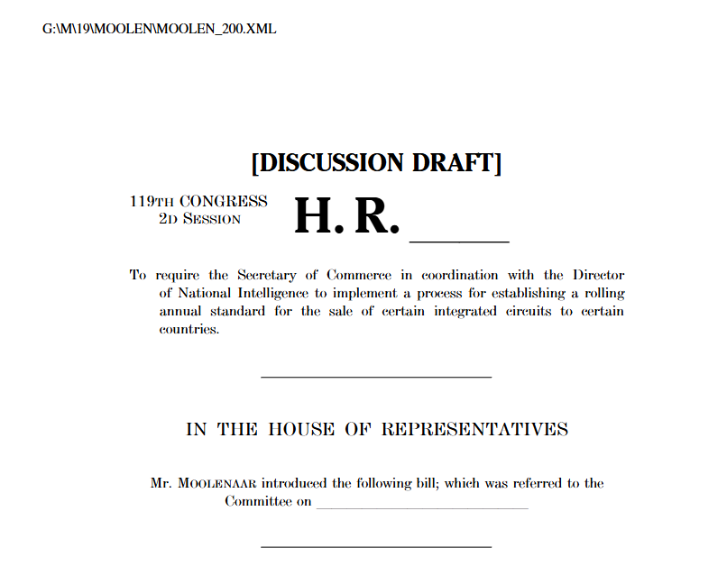 近日,美国密歇根州共和党议员詹姆斯・穆勒纳尔提出《半导体控制调整以限制出口法案》(《Semiconductor Controls Adjusted to Limit Exports Act》,简称“法案”),要求美国商务部长与国家情报总监共同制定年度管制标准,对特定国家开展特定集成电路的出口限制工作。