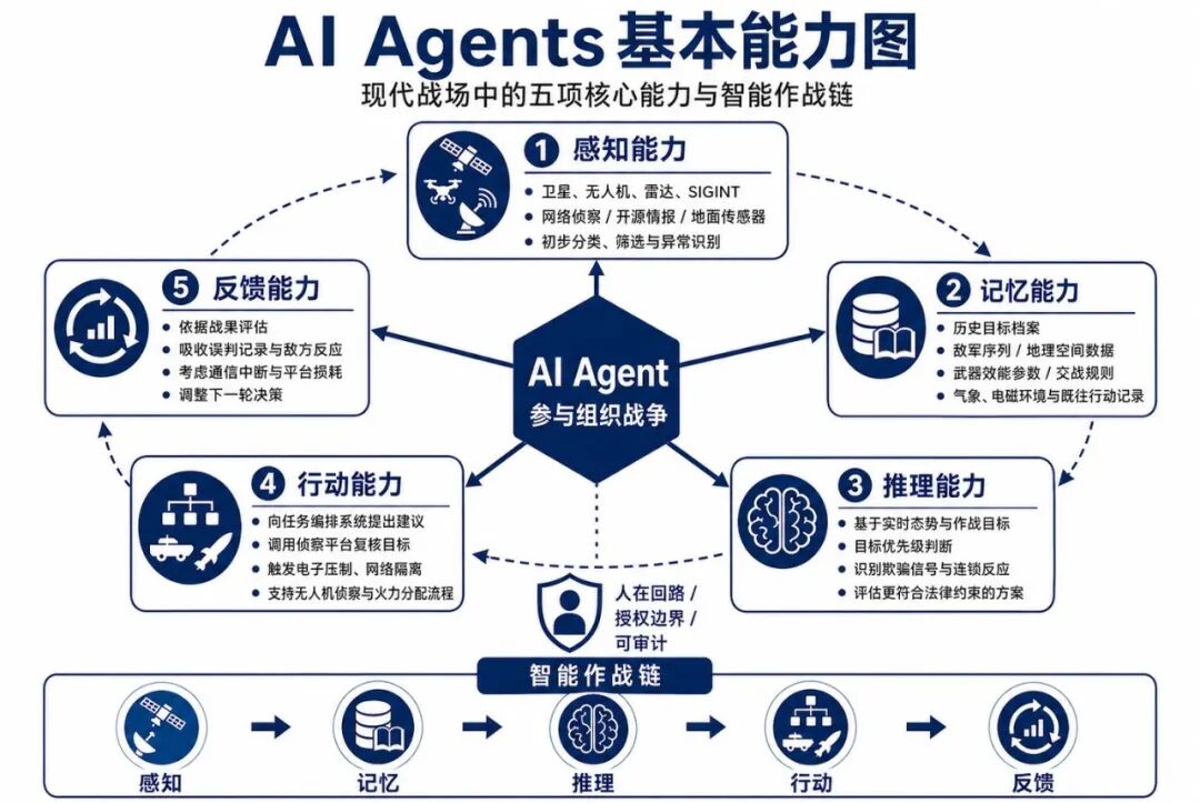 在这一结构中,AI不再只是辅助情报人员筛选影像的工具,也不只是为指挥员提供文字摘要的后台软件。它正在逐步进入现代战争的感知、理解、决策、编排、执行与反馈全过程。换言之,AI正在从“工具型系统”转变为“任务型Agent”,从后台支援能力上升为作战体系中的结构性力量。