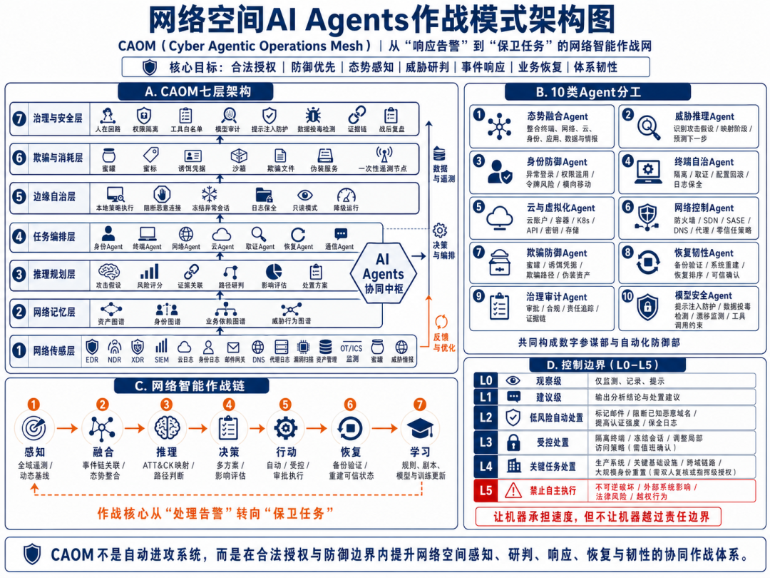 基于现代军事AI Agents作战逻辑,网络空间可构建一种“网络智能作战网”,可称为CAOM,即Cyber Agentic Operations Mesh。它不是某个单一产品,而是一套由多类Agent组成的网络空间感知、推理、编排、处置和恢复体系。