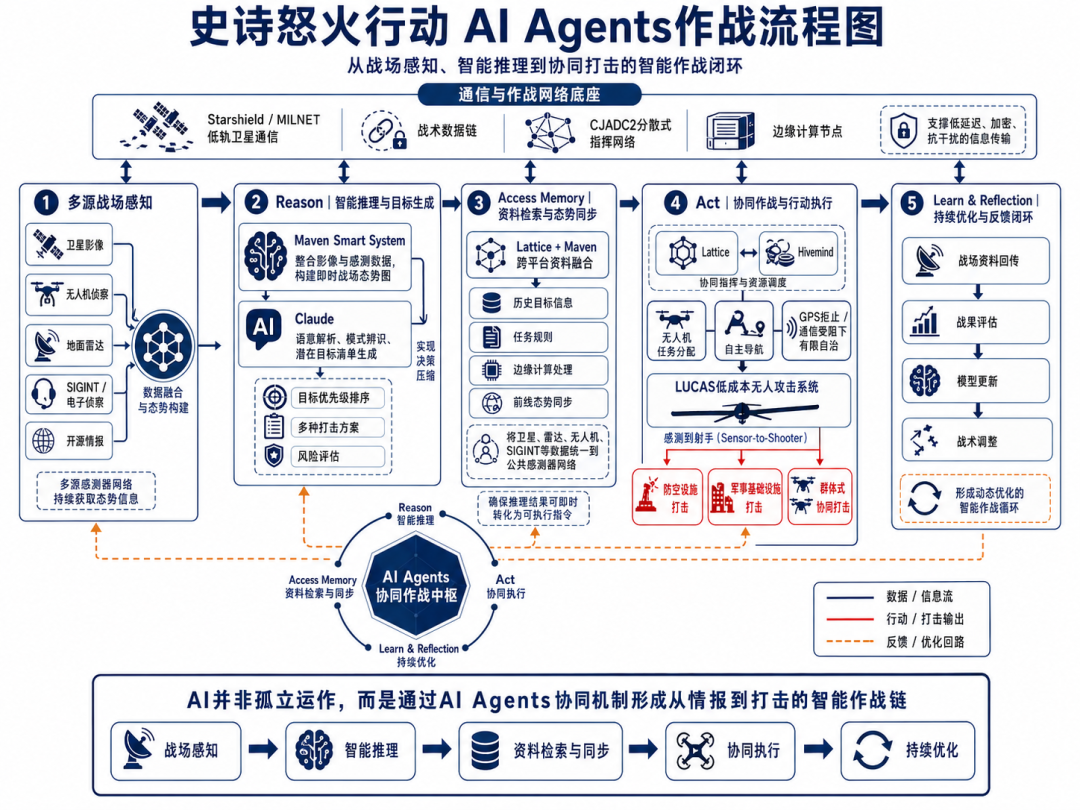 动针对伊朗的“史诗怒火行动”,目标包括伊朗进攻性导弹、导弹生产能力、海军力量以及其他安全基础设施;美国官方随后宣称,相关军事目标已经达成。但从战争学和人工智能技术演进角度看,这场行动最值得关注的,并非单一武器平台的性能展示,而是多类AI系统、卫星通信、战场管理平台、自主无人系统与人类指挥体系之间形成的协同作战结构