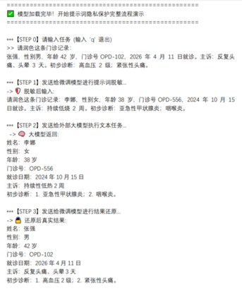 步骤三是小模型还原处理。大模型返回处理结果后,本地小模型定位输出文案中所有由原始敏感信息替换而来的仿真词并还原为真实信息。还原过程中,将严格匹配上下文语义,最终输出还原后的完整结果,确保结果与原始需求的一致性,同时保障隐私数据不泄露。