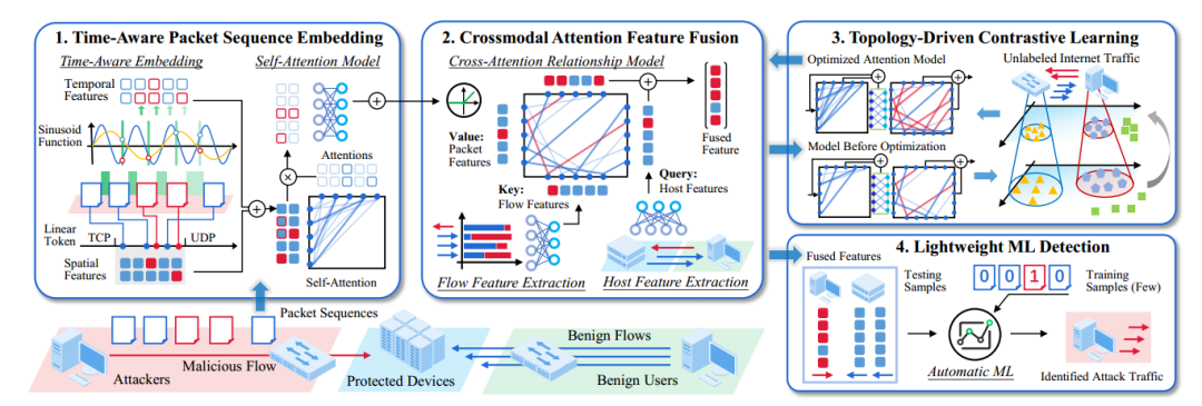 如图1所示,tFusion 的整体流程主要包括四个阶段。首先,系统通过时间感知的数据包序列嵌入对数据包序列进行时间感知嵌入,在编码包长信息和到达时间间隔信息的基础上,利用自注意力机制提取细粒度的包级时序特征。其次,系统进入跨模态注意力特征融合阶段,提取流级统计特征和主机级交互特征,并以主机级特征作为query、流级特征作为key、包级特征作为value,构建跨模态注意力关系模型,实现多粒度特征融合。随后,论文进一步设计了拓扑驱动的对比学习,利用大规模无标签互联网流量对模型进行预训练,使其在不同网络拓扑环境下获得更强的泛化表示能力。最后,在部署阶段,系统只需从目标网络中随机抽取极少量流量样本,在完成人工标注后,即可借助轻量级机器学习检测模块训练轻量级的监督或无监督模型,从而完成实际检测任务。
