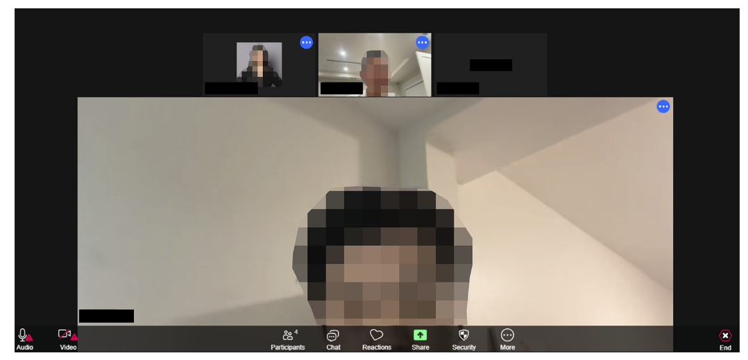 上图为受害者加入假会议时所看到的景象。其他“参与者”可能是被盗、被窃取的受害者摄像头视频、AI生成的虚拟形象,或两者混合。