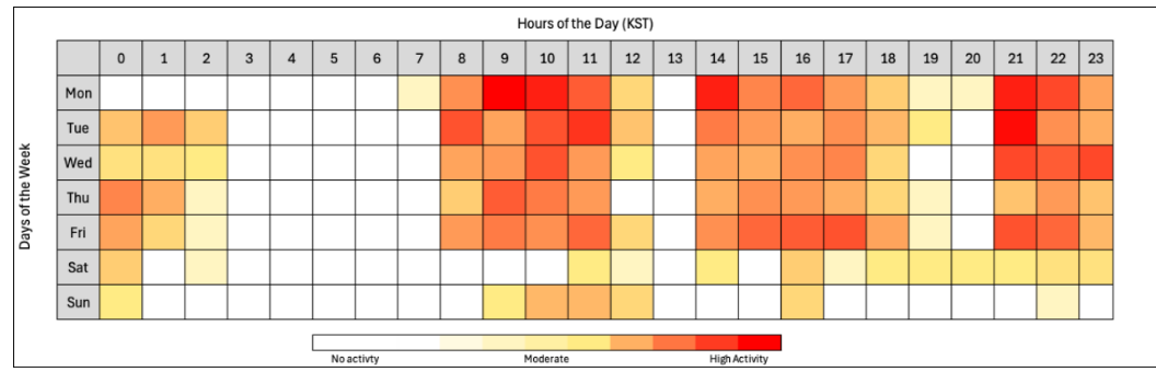 每日活动热力图显示,峰值操作时段为 09:00 至 17:00 韩国标准时间。