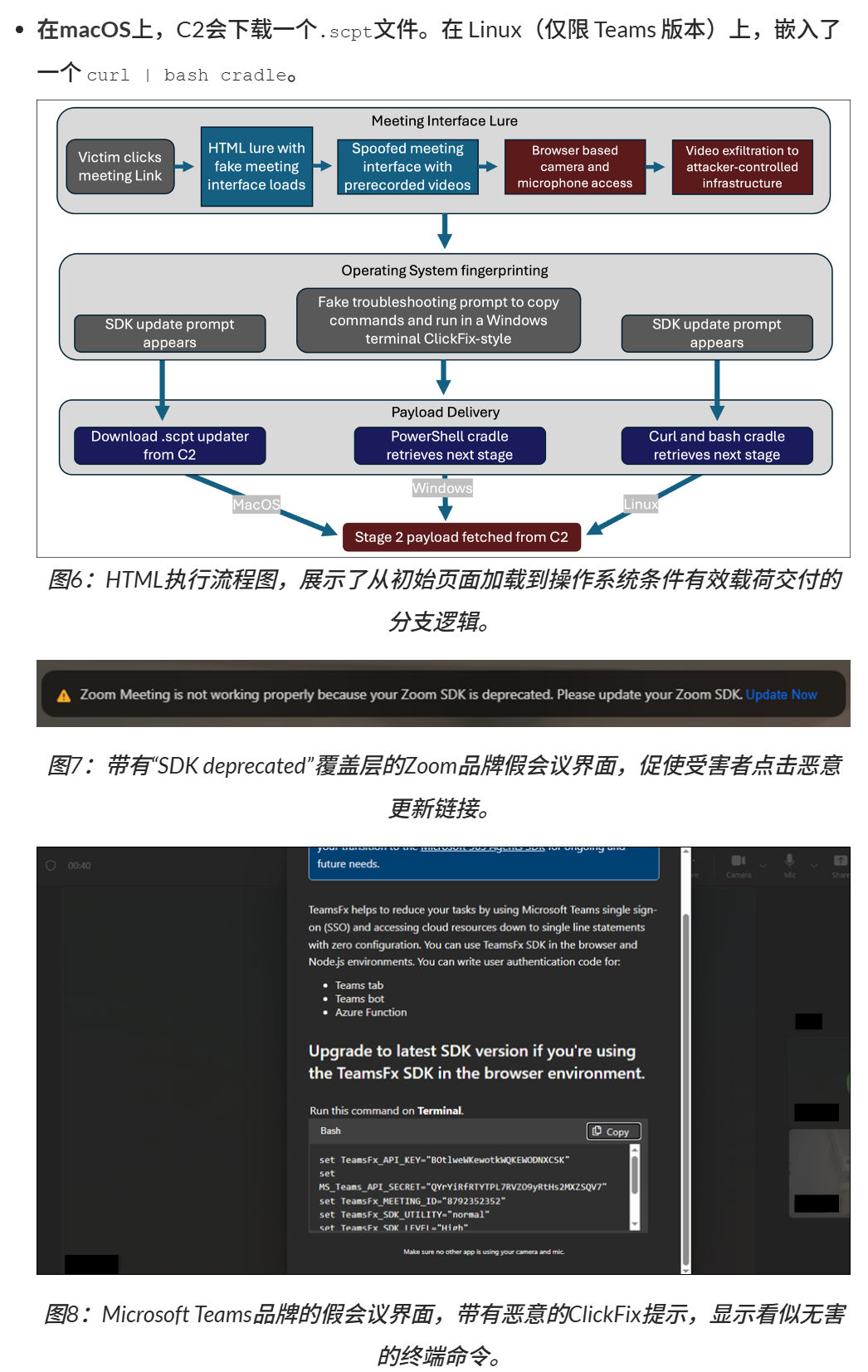 受害者进入假会议八秒后,虚假 Zoom 或 Teams 窗口上的一个持久覆盖层宣布受害者的 "SDK 已过时",并向他们提供一个 "立即更新" 按钮。在 Windows 上,一个假的支持对话框显示看起来是良性的诊断环境变量命令。当受害者点击 "复制" 或按下 Ctrl+C 时,应用程序会静默拦截剪贴板写入,并用攻击者提供的远程代码执行摇篮替换显示的内容。
