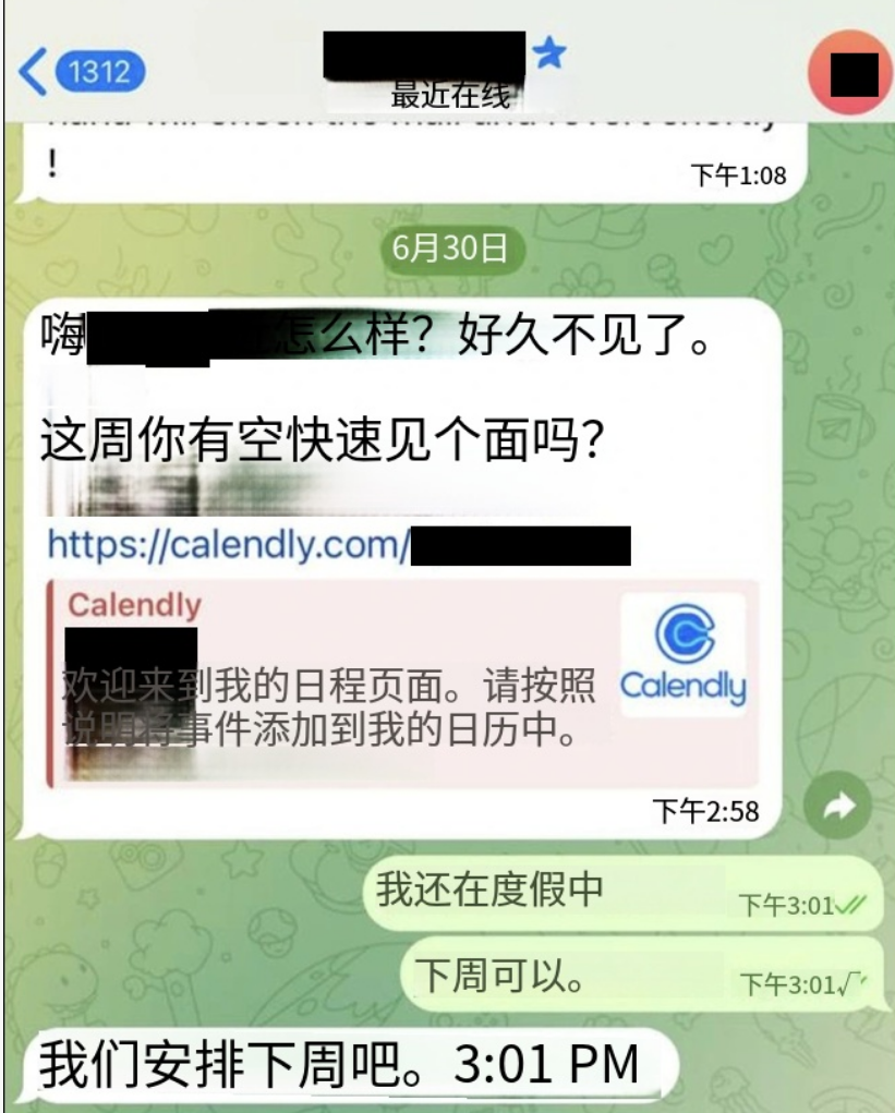 后续扩大调查发现的证据进一步证实了这一模式。有受害者在 LinkedIn 公开披露其身份被用于诈骗,发布的截图显示攻击者从被入侵的 Telegram 账户发送消息,向新目标发送 Calendly 链接发起 "叙旧" 会议。