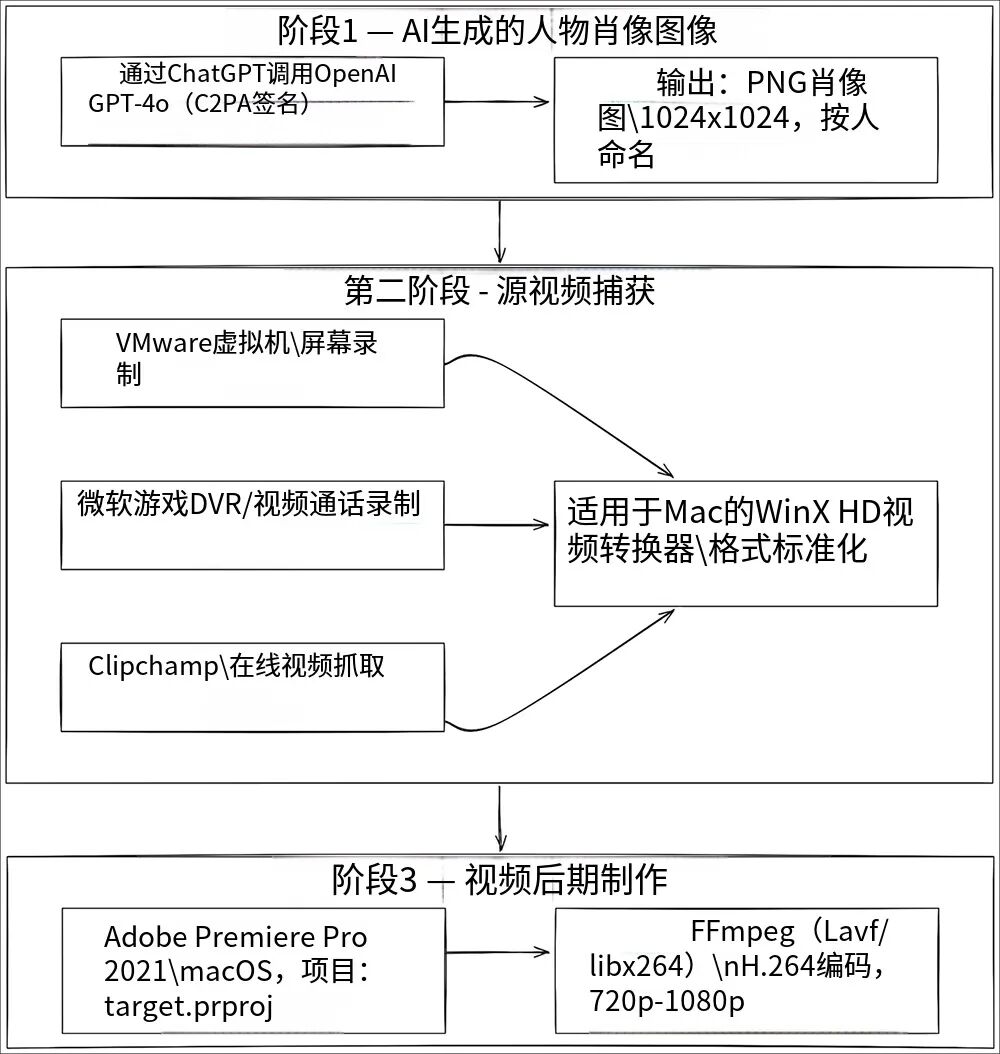 对攻击者托管媒体的深度元数据分析,揭示了一套精密的四阶段生产流水线,用于批量制造假会议参与者视频: