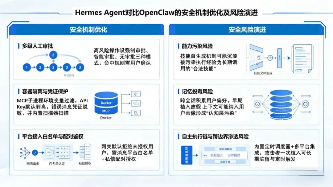 图2.Hermes Agent对比OpenClaw的安全机制优化及风险演进