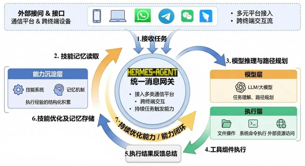 Hermes Agent(简称“Hermes”)是一个可部署于本地服务器的开源自主智能体框架。它通过统一网关支持接入微信、飞书等多个即时通信平台,能够调用工具执行命令,并支持持久化记忆。与传统静态工具执行模式不同,Hermes可在完成复杂任务后自动提炼可复用技能,并在后续任务中检索调用,实现能力持续积累。