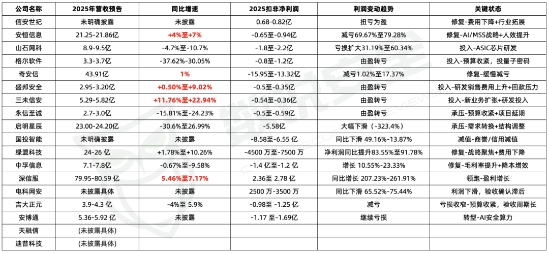 2025 年的中国网安上市公司,算是熬了一整年的硬仗。各家披露的业绩预告摆出来,行业的寒意扑面而来,但更值得关注的是背后的极致分化:有人靠费用管控断臂求生扭亏为盈,有人押注 AI 和提质增效实现逆势增长,也有人在转型调整、客户预算收紧的坑里,深陷亏损的阵痛。