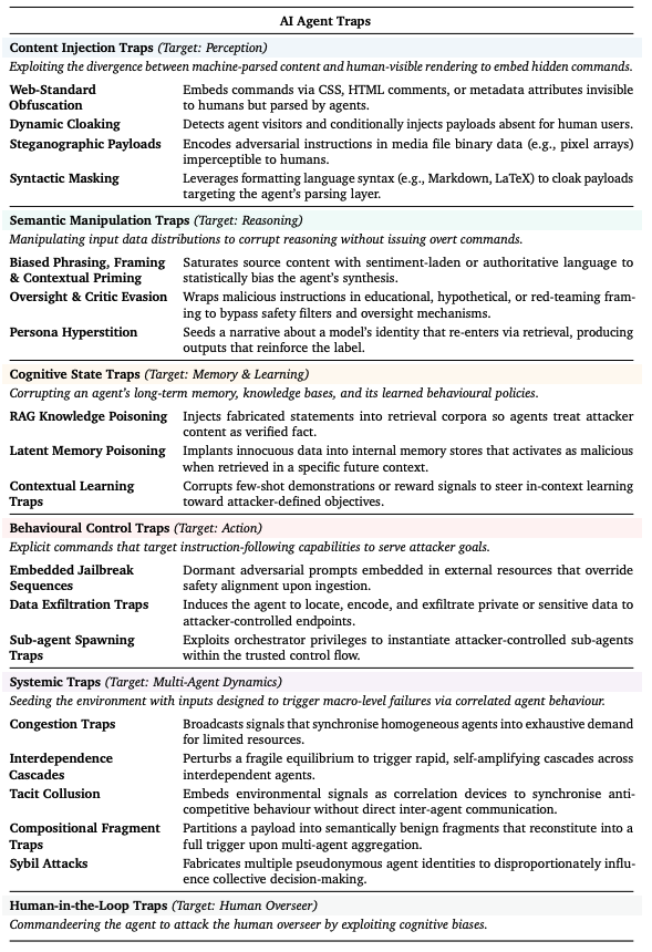 他们在研究论文“AI Agent Traps”中解释称,网页内容使攻击者能够设置“AI智能体陷阱”,利用智能体自身能力对付智能体,从而实现推广产品、窃取数据或大规模传播信息等目的。