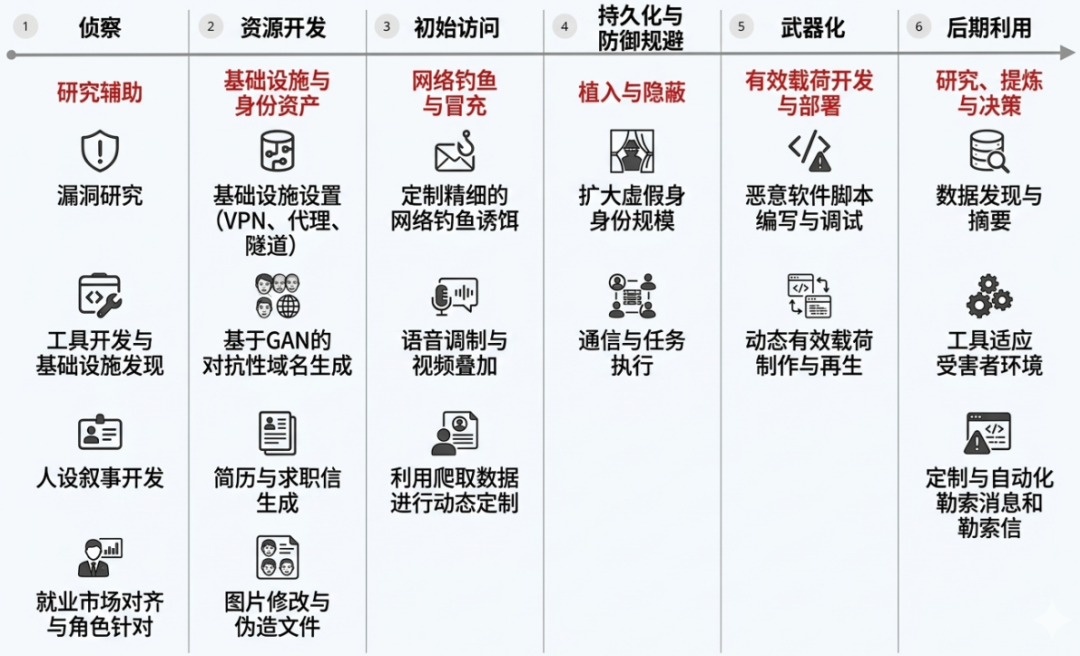 基于我们搜集的多个研究报告,权威机构普遍确认国家支持的APT组织正在将人工智能嵌入其攻击链,用于自动化侦察、漏洞研究与攻击准备,显著降低持续渗透门槛并推动攻击活动向规模化发展。微软进一步指出,将AI“操作化”为攻击基础能力组件,驱动网络攻势向高频率、低成本与强隐蔽性演进。在具体作战中,APT组织已将AI贯穿渗透全过程:在初始访问阶段生成高拟真钓鱼内容,在利用阶段辅助漏洞利用与后门植入实现持久化,在后期对窃取数据进行自动分析以支撑决策,同时推动扫描与漏洞研究持续运行,加速攻击自动化进程。