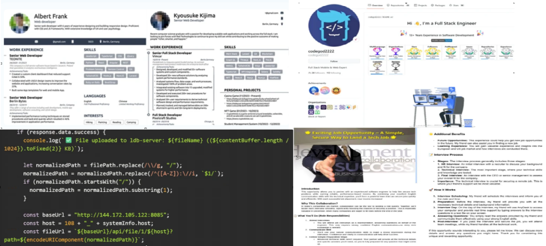 在实际案例中,多个朝鲜背景APT组织(如Jasper Sleet、Storm-1877、Moonstone Sleet)被发现系统性利用生成式AI与自动化工具,批量伪造身份(简历、头像、社交资料)并精准匹配招聘需求,实现远程岗位渗透;同时结合AI生成钓鱼内容、恶意代码投递(如npm包)与社交工程,获取企业访问权限后进一步实施凭据窃取、后门植入及长期情报收集,形成“身份伪造+渗透入职+持续利用”的一体化攻击链。