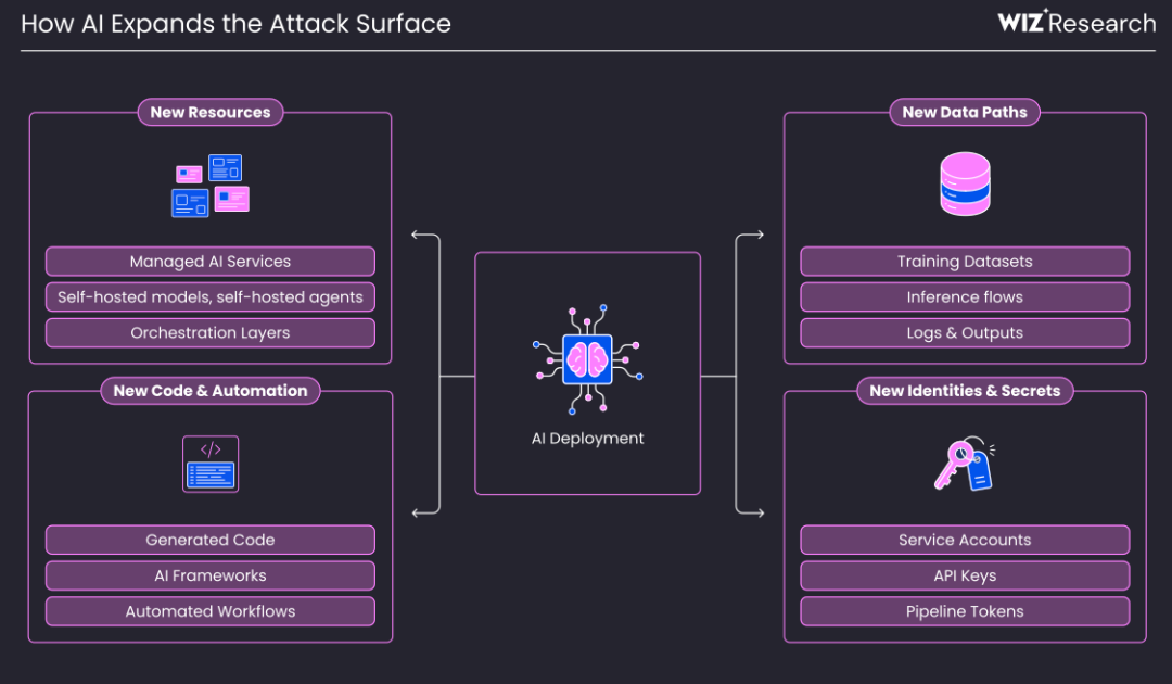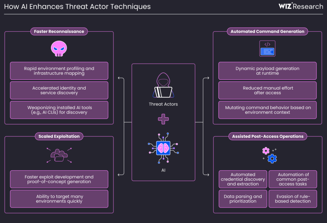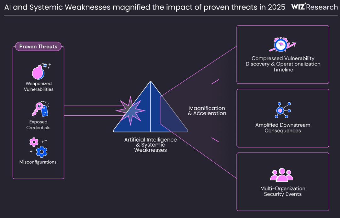 2025年,AI技术对云安全的影响终于从理论走向现实。但WIZ报告指出,2025年,AI并未引入任何全新的云攻击技术。AI对安全的影响主要是扩大了攻击面,并加速了现有攻击技术的执行速度和规模。