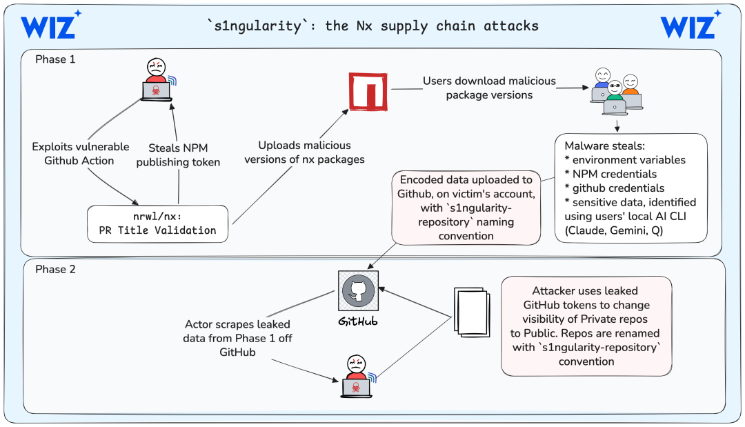 s1ngularity攻击与Shai Hulud如出一辙,但目标指向了开发团队广泛使用的共享构建工具和自动化工作流。攻击者通过污染流行的Nx构建系统,将恶意代码注入到所有使用该工具的项目中。受影响的组织并非因为自身存在独特的配置错误,而是因为采用了行业常见的工具链和集成模式。