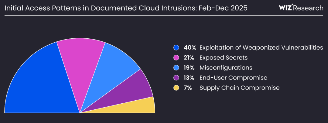 Wiz《2026 云威胁回顾报告》显示,2025 年80% 的公开云入侵事件,仍源于漏洞利用、密钥暴露和配置错误这三类传统风险。