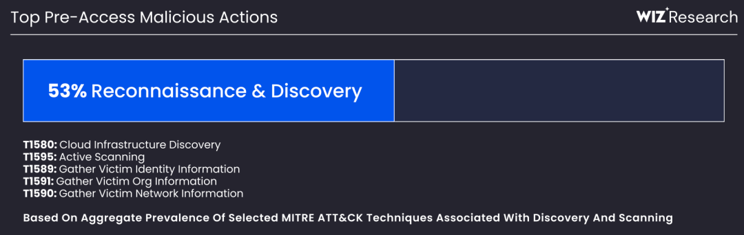 从攻击全生命周期来看,攻击者的行为模式也高度可预测。在获得访问权限之前,超过53%的高风险恶意行为属于侦察与发现活动,包括云基础设施探测、主动扫描、收集受害者身份和组织信息等。这意味着攻击者在发动实质性攻击前,会花费大量时间绘制目标环境地图,测试信任边界。