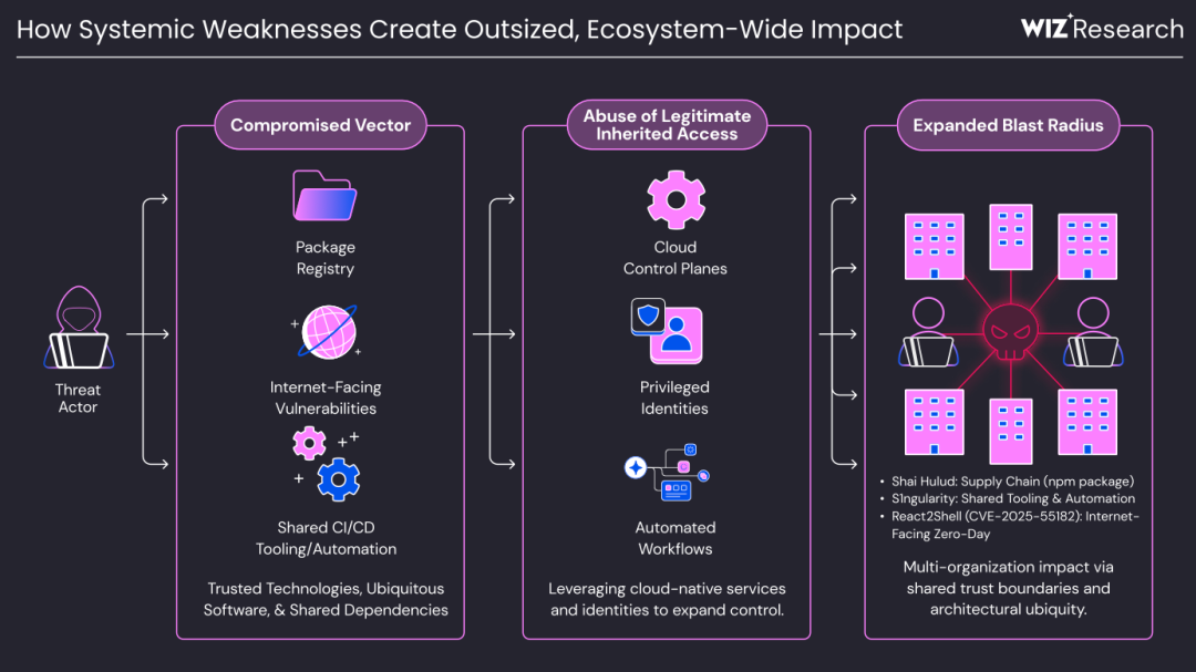 2025年最具影响力的云安全事件,无一不是利用了整个行业共有的系统性弱点。攻击者通过攻破一个广泛使用的组件或服务,就能同时影响成千上万的组织,造成"多米诺骨牌"式的连锁反应。