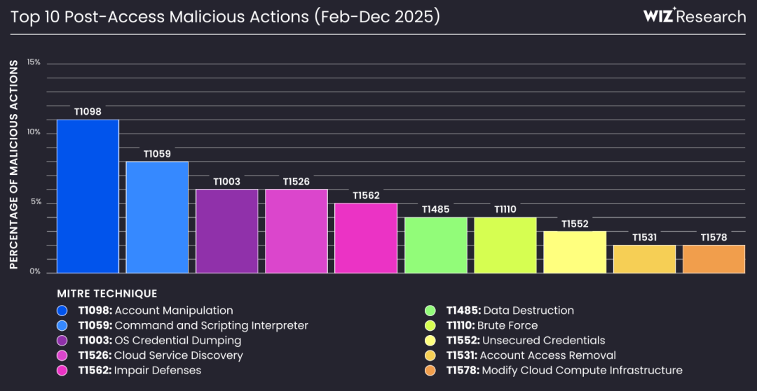 一旦获得初步访问权限,攻击者的行为会迅速转向身份操纵和资源控制。最常见的后访问行为包括账户操纵(15%)、命令与脚本解释器执行(10%)、操作系统凭证转储(10%) 和云服务发现(10%)。与传统网络攻击不同,云环境中的攻击者很少依赖主机级别的横向移动,而是优先利用云原生身份和控制平面来扩大权限。